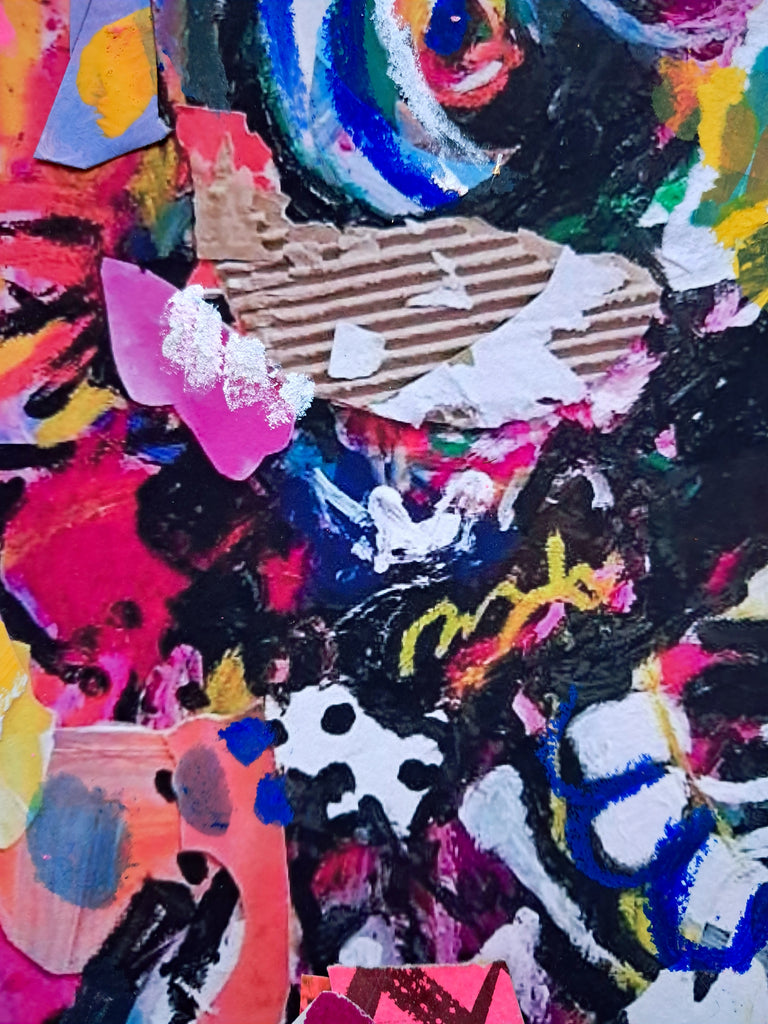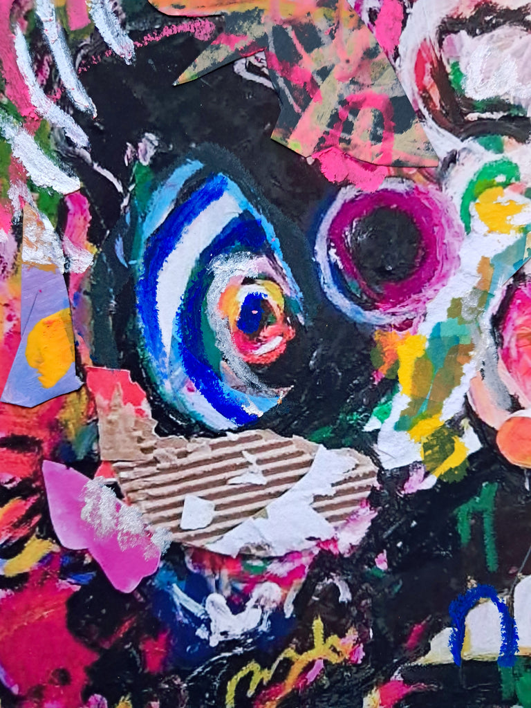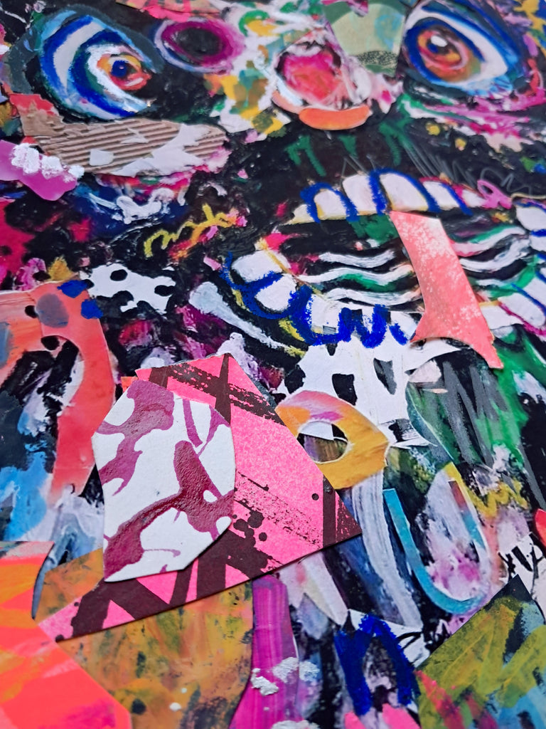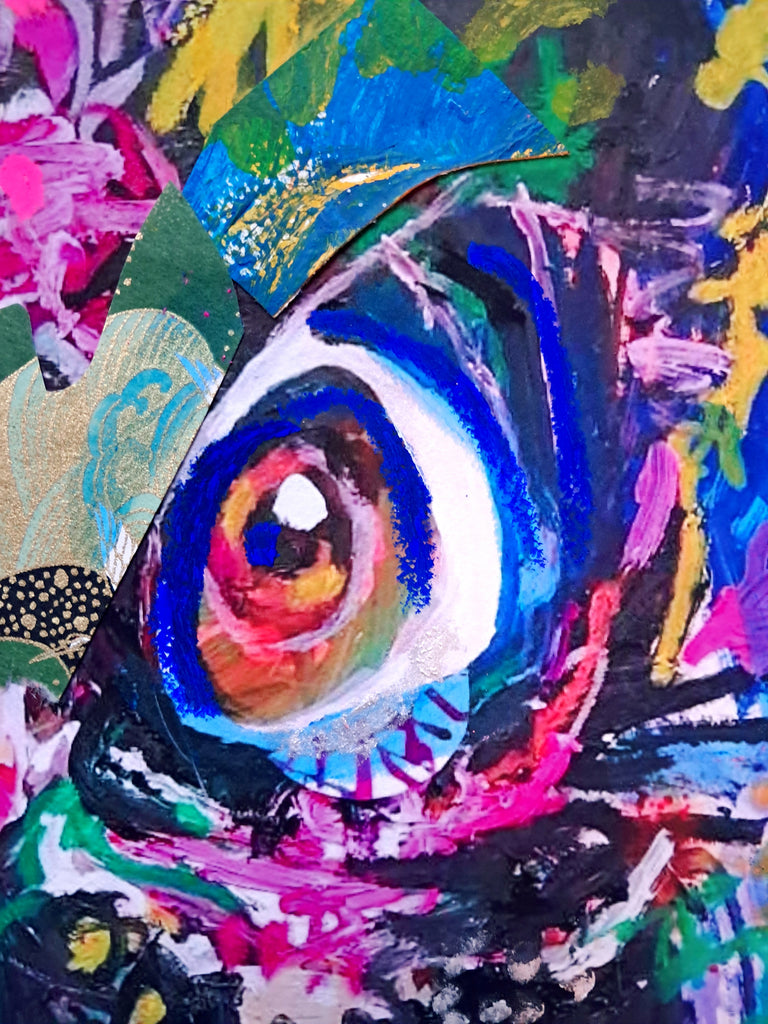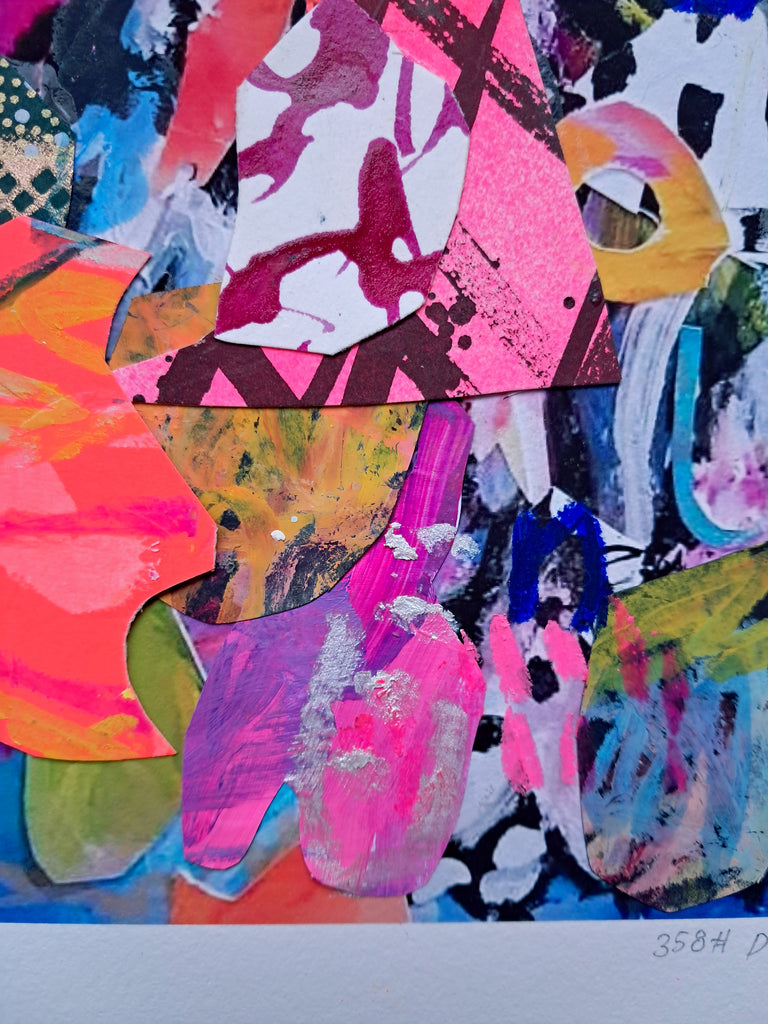 This print has been HAND EMBELISHED with collage, Japanese Washi Paper, Oil Stick and acrylic Paint to become a one of a kind original piece.