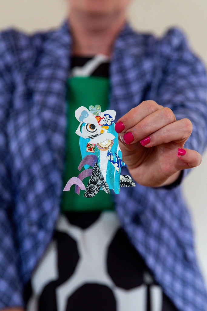 Mixed media free cut collage of a Bendigo Chinese Lion.