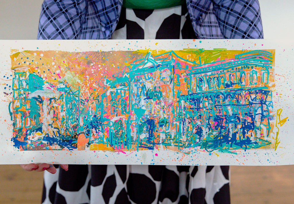 This is such a sprightly work with energy in abundance. A panoramic street scape of Bendigos CBD with the Fountain on the left and Alium, Fifi&Edga Bridal, Aussie Disposals on the right.
