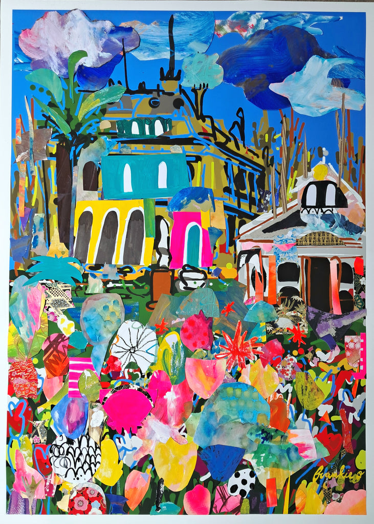 This print has been HAND EMBELISHED with collage, Japanese Washi Paper, Oil Stick and acrylic Paint to become a one of a kind original piece.
